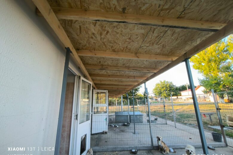 Obwohl wir ja jetzt erst die Dächer von 2 Häusern machen mussten, was mit 26.000,- € zu Buche geschlagen hat, haben wir uns entschlossen, Schutzdächer rund um 2 Gehegereihen zu bauen, so dass die Sonne nicht in die Häuser kommt und auch die Hütten zum Teil im Schatten stehen. So schön es für unsere Hunde ist, dass sie mehr Platz haben, als in vielen anderen Tierheimen, so hoch sind dann immer die Kosten, wenn wir was reparieren oder bauen müssen. Für die 2 Reihen kosten die Dächer wieder 9.200,- €.