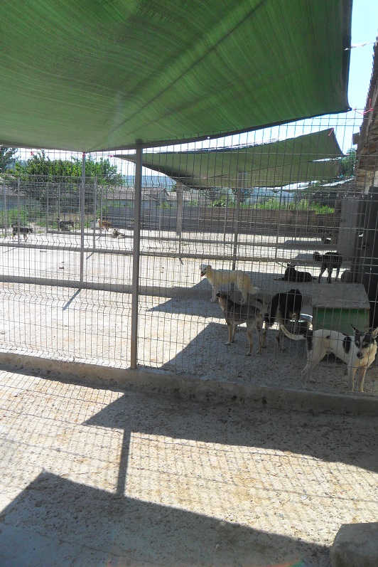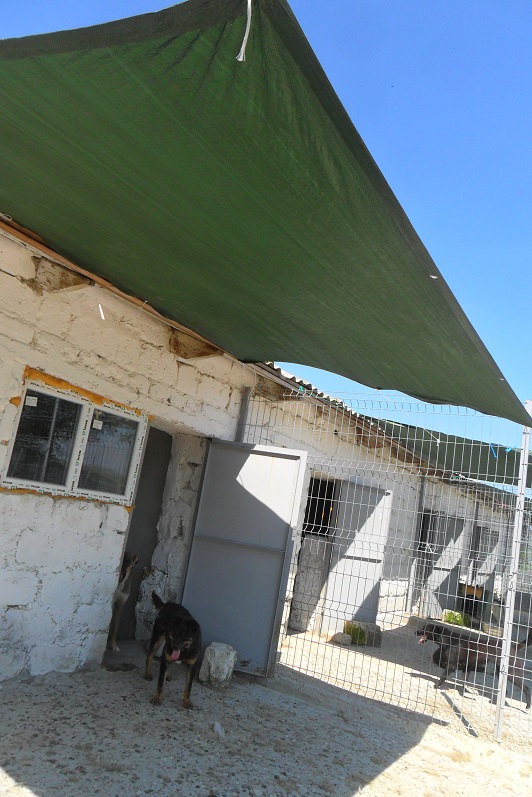Ein Teil der Planen als Sonnenschutz wurde inzwischen angebracht. Und wie man sieht, freuen sich die Hunde sehr darüber. Auch wurde ein neues Gehege für kleine Hunde (nur für den Sommer) wurde angefangen und wir haben Paletten mit Holz zusammengefügt und in die Häuser auf den Lehmboden legen lassen, damit die Hunde nicht mehr auf dem blanken kalten Boden legen müssen. Dies wird nun Haus für Haus weitergemacht, so dass bis zum Winter alle Hunde die Möglichkeit haben, auf den Paletten zu liegen (werden dann noch mit Stroh und / oder Decken ausgelegt). Und in dem einen Haus wurden neue Türen installiert, da es davor nur ganz alte kaputte Türen gab und man eigentlich alleine keine Chance hatte, zu den Hunden zu kommen. Wir freuen uns ja über jeden kleinen Schritt, der vorwärts geht…..