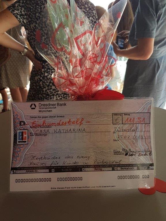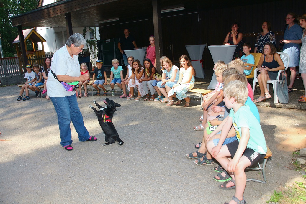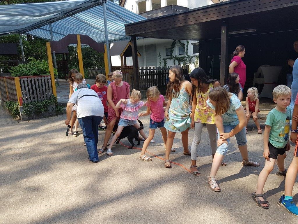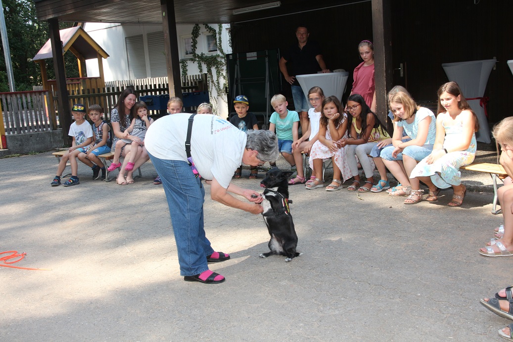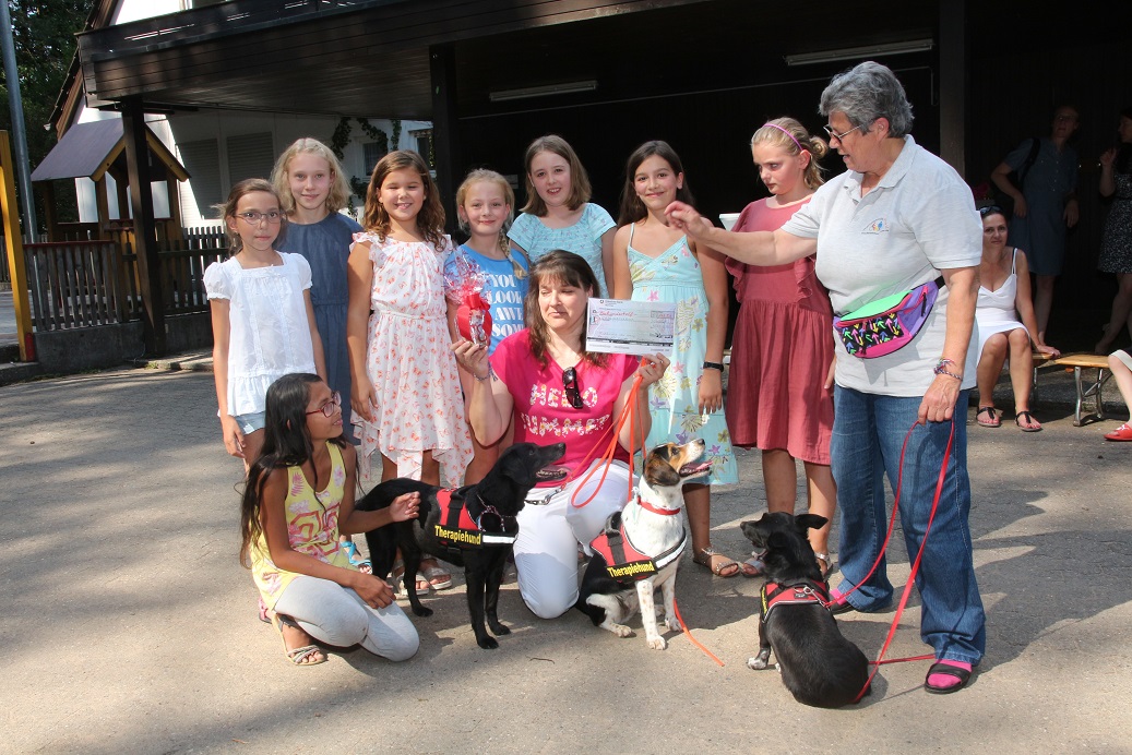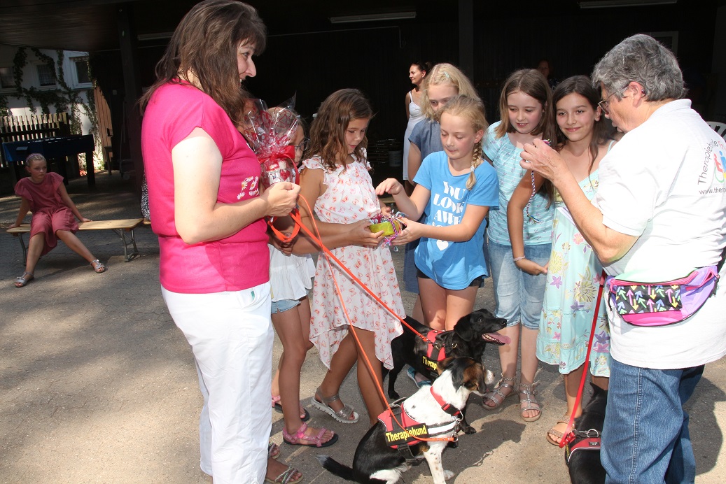 Wir haben eine liebe Einladung bekommen von Kinderhort Rückersdorf zu ihrer Abschlussfeier. Die Kinder ,die dieses Jahr den Hort verlassen, hatten eine tolle Idee. Sie wollten Freundschaftsbänder basteln und für einen guten Zweck verkaufen. Und 3x dürft ihr raten, wer diese Spende bekommen sollte?!!? Ja, genau….wir waren baff und kamen der Einladung natürlich sehr gerne nach. Also haben wir uns überlegt, wie wir den Kiddies eine Freude machen könnten und spontan unsere Edith angerufen, die mit ihren Therapiehunden ja regelmäßig Einsätze in Kindergärten und anderen sozialen Einrichtungen macht. Sie hat sofort zugesagt und so sind wir mit den Hunden Mischa, Josie und MäusMäus auf Tour gegangen. In Rückersdorf angekommen war die Überraschung grooooooß. Edith hat mit den Kindern einige Spiele gemacht. Zum ersten Mal durften Hunde die Kinder dort besuchen. Alle hatten viel Spaß und dann kam es zur großen Scheckübergabe, alle waren sehr aufgeregt. Was sollen wir sagen, sage und schreibe 111, 51 Euro haben die Mädels mit ihrer Aktion eingenommen und das wurde uns dann liebevoll verpackt überreicht. Ich möchte mich recht herzlich im Namen des ganzen Casa Katharina Teams bei den tollen Mädels Elisa, Maja, Franzi, Helena, Leni und Linda bedanken, ebenso bei der Hortleitung, die uns den tollen Besuch ermöglicht hat. Auch möchten wir Edith Danke sagen, die trotz knapp 40 Grad spontan zugesagt hat. Mädels, ihr seid spitze! Danke Euch von ganzem Herzen für diese tolle Aktion!