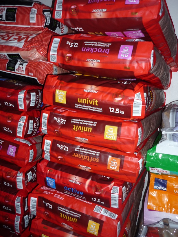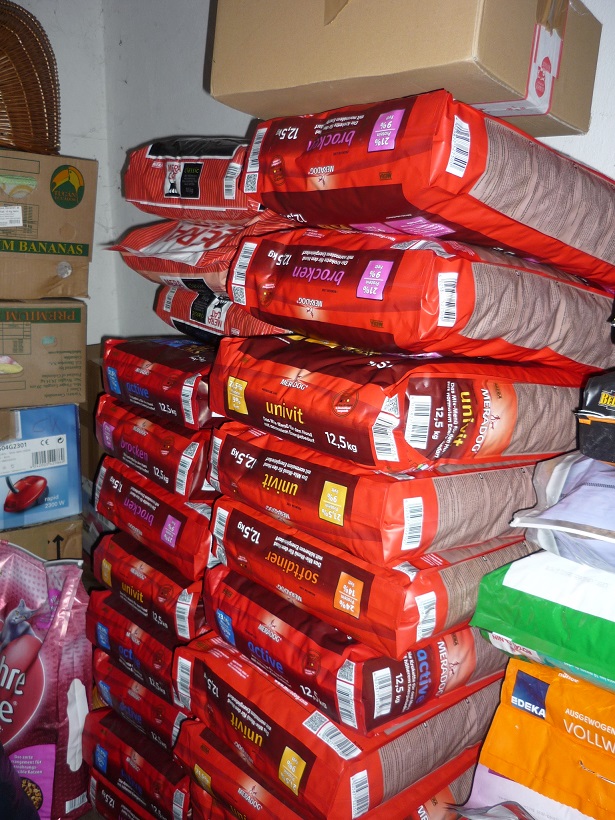 Nach dem wir Platz in der Garage für den Transport in die Casa gemacht haben, kam am Freitag auch unser „gewonnenes“ Hunde- und Katzenfutter von Meradog an. Wir möchten uns bei allen, die für uns gevotet haben und natürlich bei der Firma Meradog ganz herzlich für das hochwertige Futter bedanken. Damit können einige hungrige Bäuchlein eine Zeit gefüllt werden.