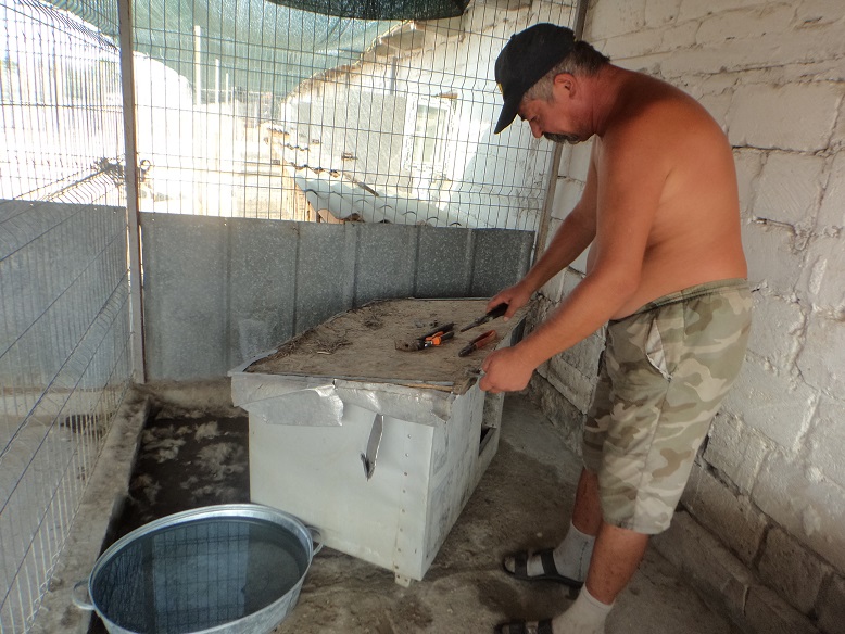 Heute möchte ich Ihnen ein paar Bilder aus der Casa zeigen, die Marion während ihres letzten Besuches im September gemacht hat (einschließlich der mitgebrachten Spenden). Einfach aus dem Alltag, wie gekocht wird, danach das große Waschen der Näpfe,  die Planen zum Schutz gegen den Wind (Provisorium) etc. Gerade jetzt für den Winter müssen wir unbedingt um die offenen Gehege Planen, oder besser Wände aufstellen, um den Wind und Schnee abzuhalten, zumal einige Gehege keinen Zugang zu einem festen Haus haben und die Hunde nur in den Hütten Schutz finden. Wir möchten auch eine neue Kochstelle bauen, die weniger Holz verbraucht (Holz ist in Moldawien sehr teuer) und auch die Brandgefahr durch Funkenflug ausschließt. Unser „Notfallhaus“ braucht dringend neue Fenster, da diese z.T. kaputt sind und es auch da dann rein zieht und teilweise sogar rein schneit. Wir werden übernächste Woche wieder im Heim sein und hoffen, dass wir in der leider nur kurzen Zeit doch einiges machen können, um den Tieren den Winter zu erleichtern. Auch möchten wir unsere Pflegerinnen, die die Straßentiere füttern und die privaten Tierschützer, die sich auch um die Straßentiere kümmern, mit Futter versorgen. Denn diesen Tieren geht es ja am allerschlimmsten. Leider benötigen wir noch für unsere Tiere selbst einiges an Hundehütten, damit wirklich jedes Tier einen gesicherten Platz hat, bevor wir anfangen können, den Tierschützern für ihre Schützlinge auf der Straße Hütten zur Verfügung stellen zu können.