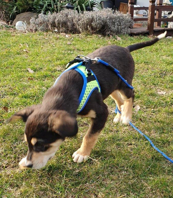 Den Garten findet er toll. Hier ist er bereits fröhlich durch die Gegend gehüpft. Wiese und Sonnenschein…. perfekt für ein kleines Hundekind. Er bleibt in der Nähe und holt sich immer wieder Streicheleinheiten ab. Nachdem er noch viel Ruhe benötigt, geht er nach Ausflügen in den Garten selbständig für ein Nickerchen in die Box.