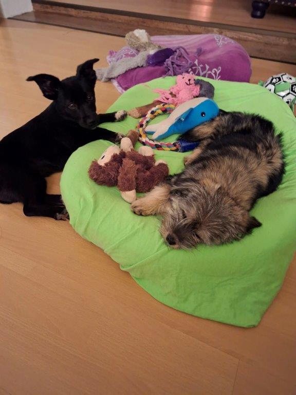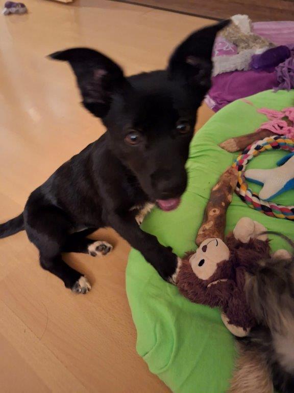 Wer schenkt der schwarzen Großohrmaus CORRY sein Herz? Das kleine Mäuschen geb. 11.08.2025, ca. 22 cm groß und wiegt 5 kg. Sassi kam frisch aus Rumänien und genießt bereits ihr neues Leben. Streicheleinheiten, Kuschelkörbchen, viel Schlaf und ausreichend Futter…. sie hat die schlechten Erinnerungen an den schrecklichen Zwinger längst vergessen und erkundet neugierig und fröhlich die Spielzeugkiste. Mit den Hunden und Katzen auf der Pflegestelle hat sie sich bereits angefreundet. Jetzt suchen wir Menschen, die am Anfang keine großen Erwartungen haben, sondern sie mit viel Geduld und Liebe an die Pfote nehmen und ihr das Hunde 1×1 beibringen. Die sich auch bewusst sind, dass Welpen in dem Alter nicht stubenrein sind, noch nicht alleine bleiben, viel Aufmerksamkeit benötigen und vielleicht etwas anknabbern. Der Umgang mit Kindern kann nicht getestet werden. Dürfte allerdings kein Problem sein, wenn Kinder den vorsichtigen Umgang mit Hunden gewöhnt sind. Wer möchte CORRY auf ihrer Pflegestelle in Obertrubach besuchen? CORRY wird gechipt, komplett geimpft und mehrmals entwurmt in ihr neues Zuhause umziehen,den negativen Snap 4d Test hat sie ebenso. Sie wird mit Vorkontrolle und Vertrag gegen eine Schutzgebühr über die TNH Casa Katharina vermittelt.