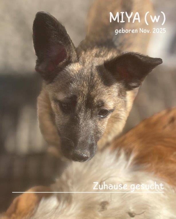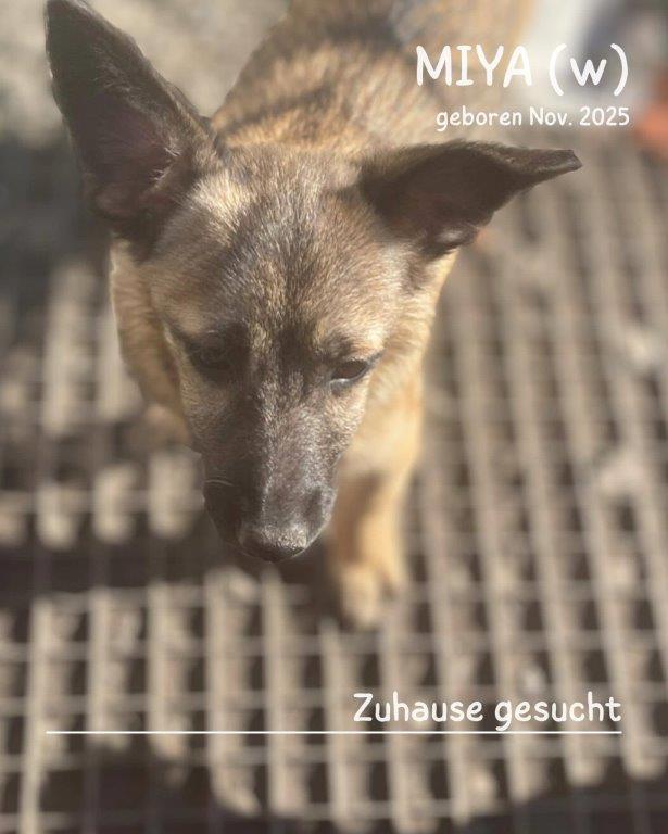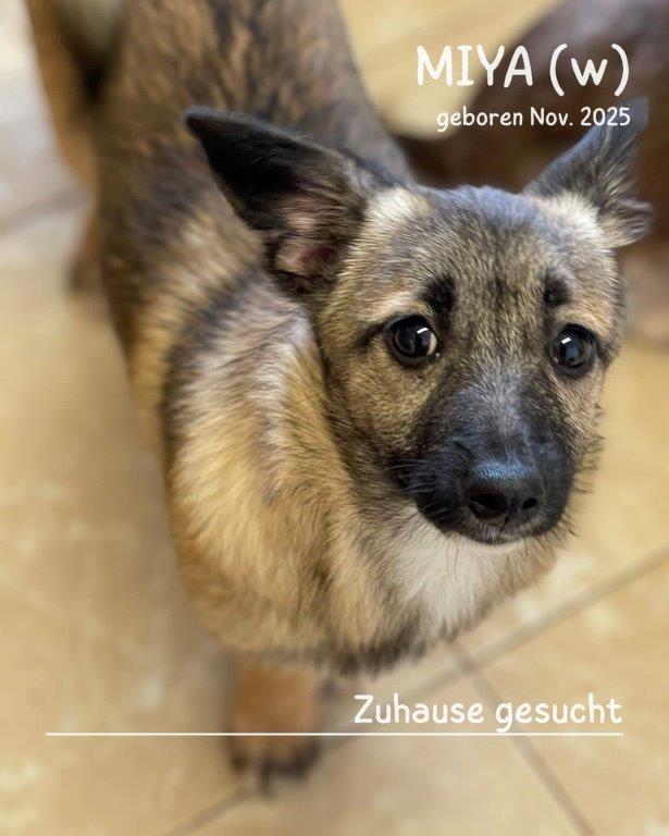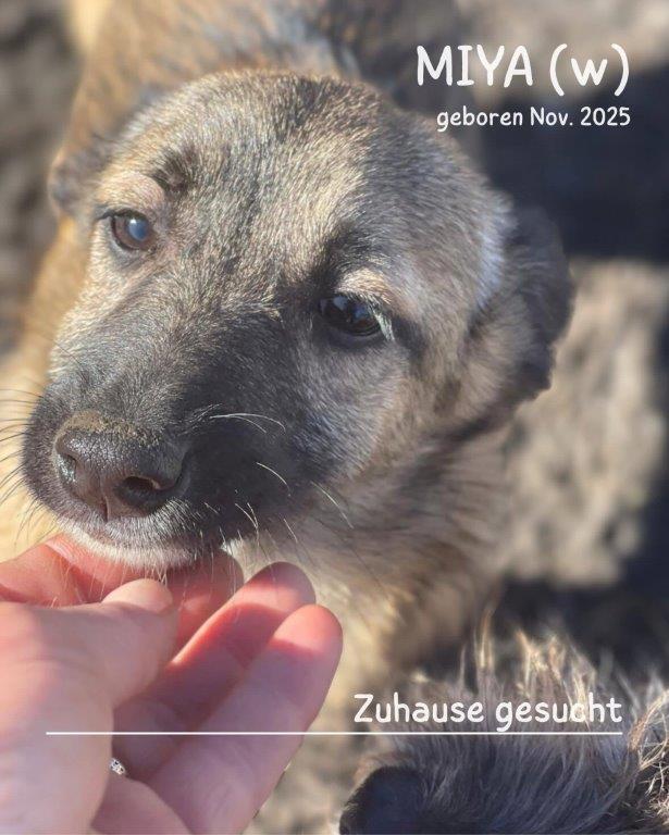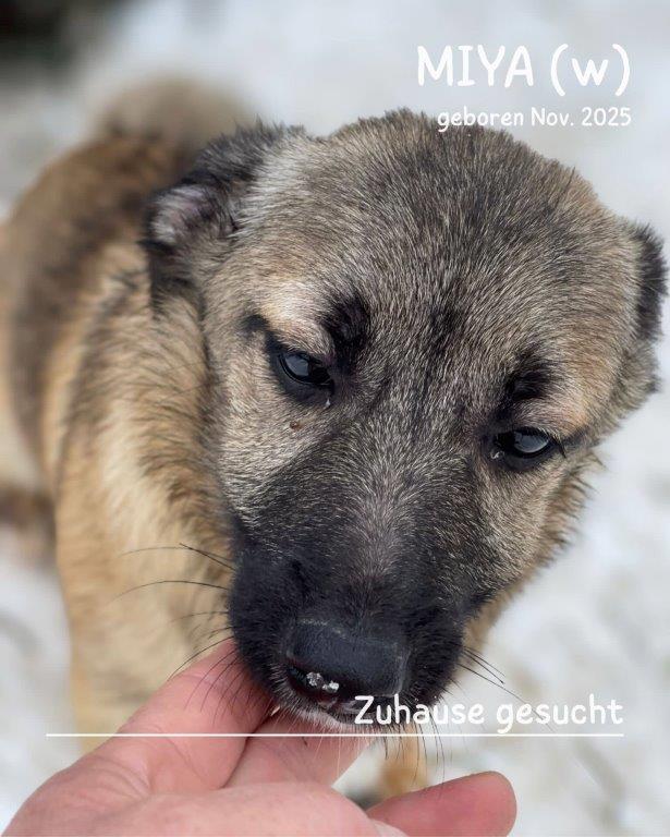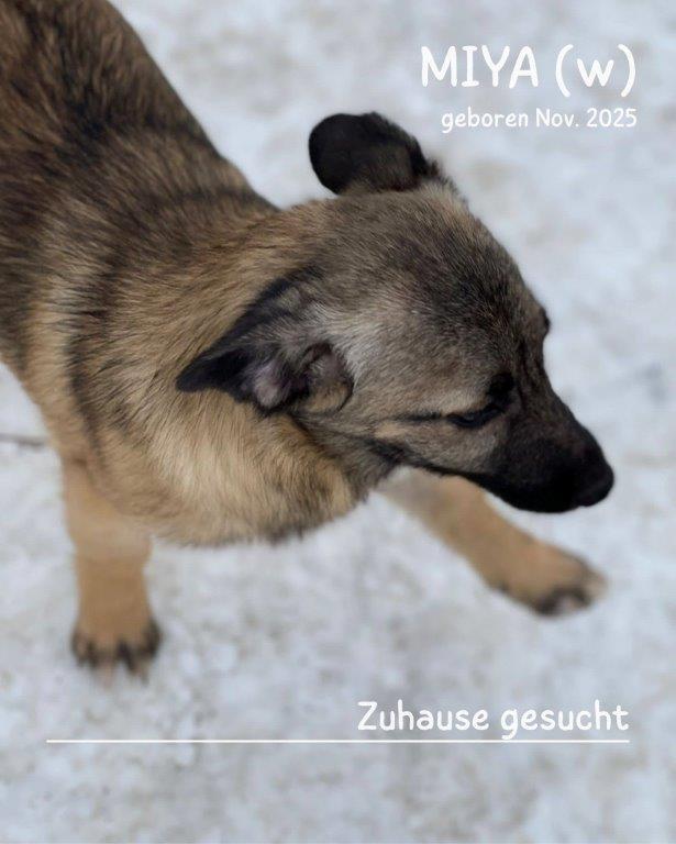 Wir könnten jetzt eine rührselige Geschichte von einer dramatischen Rettungsaktion erzählen, aber die Realität ist einfach, dass MIYA verlassen irgendwo in Rumänien gefunden wurde. Wie die meisten Hundekinder . Aber für das kleine Mädchen war es dramatisch. MIYA wurde zum Glück gefunden und liebevoll von Dana aufgenommen und gepäppelt. Ein eiskalter Winter geht in Rumänien dem Ende zu und nicht alle Welpen konnten dem standhalten. MIYA hatte Glück und es geht ihr heute prima. Das kleine Hundemädchen lebt bei Dana in der Welpengruppe und darf auch mehrere Stunden am Tag in den offenen Auslauf, um sich mit den anderen auszutoben. Gut, dass der Schnee jetzt weg ist, denn darin ging MIYA fast unter. Geboren: November 2025 Endgröße: circa 30/35 cm Ausreisebereit Gechipt, EU-Ausweis MIYA zieht es in die weite Welt. Sie würde gerne eine Fremdsprache lernen und ihr Herz hängt nicht wirklich an dem Ort, in dem sie jetzt lebt. Wer hat also ein kleines kuscheliges Plätzchen für unsere aufgewecktes Hundekind?