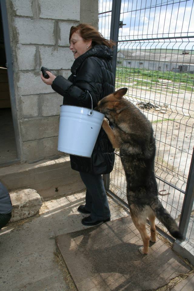 Slavik: Er hat ja eigentlich einen schönen Platz mit festem Haus, nur eben an der Kette. Dort wird auch ein großer Auslauf hin gebaut und Arielle, die Hündin, die sich in ihrem großen Auslauf mit den vielen anderen Hunden kaum aus ihrer Hütte traut, weil sie so gemobbt wird, kommt zu Slavik, sobald der Auslauf fertig ist, ins Gehege. Denn Slavik ist einfach nur ein sanfter, ruhiger Hund, der keinen Futterneid kennt und daher das Mädchen sicher in Ruhe lässt. So haben es 2 Hunde sofort viel besser.