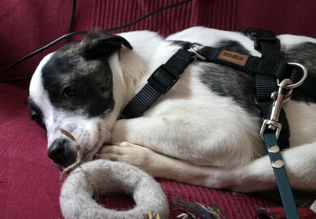 Für die kurze Zeit läuft sie schon richtig prima an der Leine (natürlich mit Luft nach oben 😉). Ihre Geschäfte erledigt sie fast alle draußen – eine kleine Streberin also!